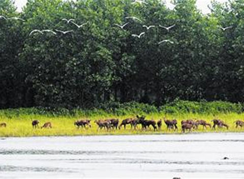 7月26日清晨,记者随保护区宣教科科长蔡家奇和管护科巡逻队队员周成志,登上冲锋舟,经长江故道向天鹅洲进发。沿途时见白鹭飞翔,野鸭嬉戏。而冲锋舟所经之处,以前是高高的芦苇,现在却没入水下,不见踪影。“看,那就是麋鹿!”拐过几道浅湾,蔡家奇指着远处一块地势较高的树林叫道。记者通过望远镜看到,在一片尚未完全淹没的芦苇荡中,一群麋鹿正在觅食。