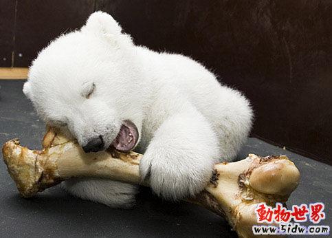 3月17日,在德国纽伦堡动物园,小北极熊弗洛克在啃骨头。