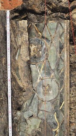 而玉棺的发现更为惊人,现场已发现玉棺的一面侧板相对完整的倒塌情形,侧板上镶嵌有大量菱形玉片,中间则用刻有纹饰的玉壁填充,而在玉片之间的连接处均用金箔条和银箔条进行贴边镶嵌,玉壁上则用银片进行粘贴,外表上金光、银光、玉光交织在一起,分外鲜明。在棺木上,细细查看,不难看出一些闪亮的纹饰,“这座棺木是金镶玉的,十分罕见。目前,只有河北满城汉墓和徐州狮子山楚王陵出土过。”