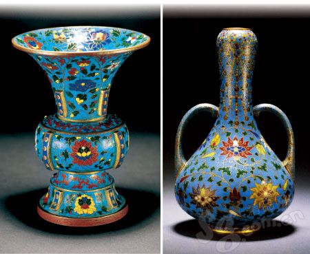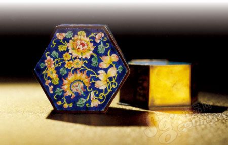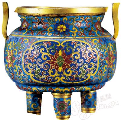 喜欢景泰蓝的人大部分是钟情于其华丽的纹饰和优美的造型,为景泰蓝制作工艺的复杂所折服。其实,景泰蓝又称铜掐丝珐琅。数百年前,掐丝珐琅技术从阿拉伯国家传入中国,经工匠改造,发展为厚胎掐丝珐琅和薄胎掐丝珐琅两种,在明代景泰时期(公元1450~1456年)得别名“景泰蓝”。据《日下旧闻考》记载,明景泰年间,宫廷设有制作景泰蓝的作坊御用监,出品在质料上取得空前发展,炼出许多新的釉料色。