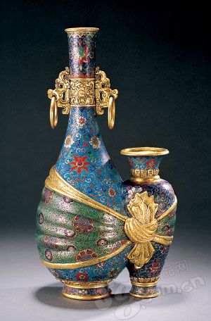 此件双联瓶是宫廷巧匠迎合乾隆品位所作景泰蓝精品。两瓶连为一体,雕塑一包袱将二者捆在一起,结扣置于中间,形象生动,足具趣味。底书“乾隆年制”款。
