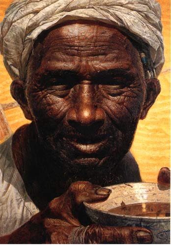 罗中立(1948年——)于一九七八年考入四川美术学院深造。《父亲》一画曾获“中国青年美展”一等奖,其画面具有一种悲剧性的震撼力,表现了生活在贫困中的老农形象;老农开裂的嘴唇、满脸的皱纹以及手中粗劣的碗等等写实的描绘,消除了观赏者与作品之间的隔膜,画家藉此来对传统文化和民族进行反思。