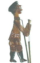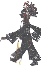 (7)订缀∶在影人的两手、两下臂、两上臂、上身、下身和两腿十个部件的关节点处,用线订缀起来,再用一皮条包围在上身的脖领处作为安装影人头的插口。最后在脖领前订上一根铁丝作为支撑影人的主杆,在两手端处用线各拴一根铁丝为耍杆,插上影人头后,一件完整的皮影人即告完成。