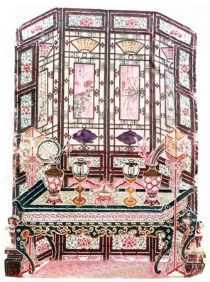 ( 4 ) 着色∶现今常用透明色料取代过去的传统色料,既方便,透光效果又好。着色时,主要使用红、黄、青、绿、黑五种纯色,一般互不调配,但可分深浅色区分层次,进行平涂,双面着色。