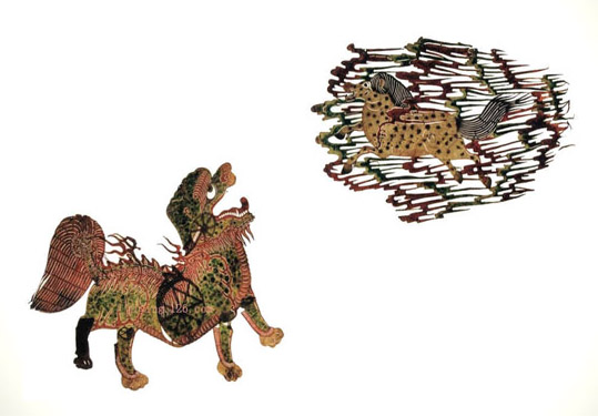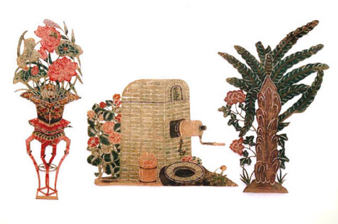 皮影除了人物造型以外,还有龙凤禽兽、花树虫鱼、山石门景、亭台殿阁、军帐兵器、陈设用具,车船马轿、城桥塔寺等等,其造型都与皮影人物相谐调,无不透着鲜明的皮影艺术特色。