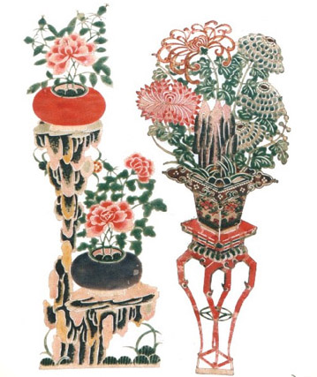 ( 3 ) 雕镂∶将描好图样的皮料垫在木板或蜡板上进行镂刻。镂刻的技法很多,西北部地区艺人善用推皮走刀的刻法,并用多种型刃刀具进行雕凿。而东北部地区一般不用型刃刀具。雕镂完毕后,擦洗干净,压平着色。