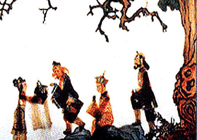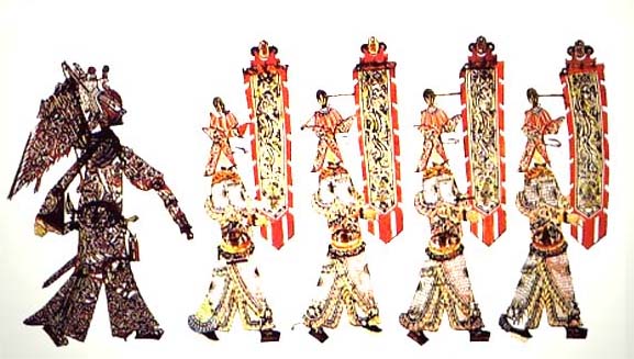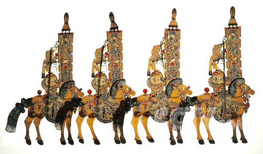 中国皮影艺术从十三世纪元代起,还随军事远征和海陆交往,相继传入了波斯(伊朗)、阿拉伯、土尔其、暹罗(泰国)、缅甸、马来群岛、日本以及英、法、德、意、俄等亚欧各国。