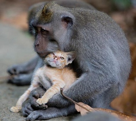 据英国《每日电讯报》消息,印尼巴厘岛“猴子森林公园”里,一只短尾猴把一只流浪小猫当成了孩子,短尾猴悉心照顾小猫,它们成了“相依为命的亲人”。