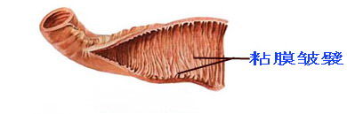 先看看人类小肠。整个肠管是食物吸收的主要部位。管腔内层不是平的,看上去是一条条紧密排列的弯弯的粘膜皱襞。