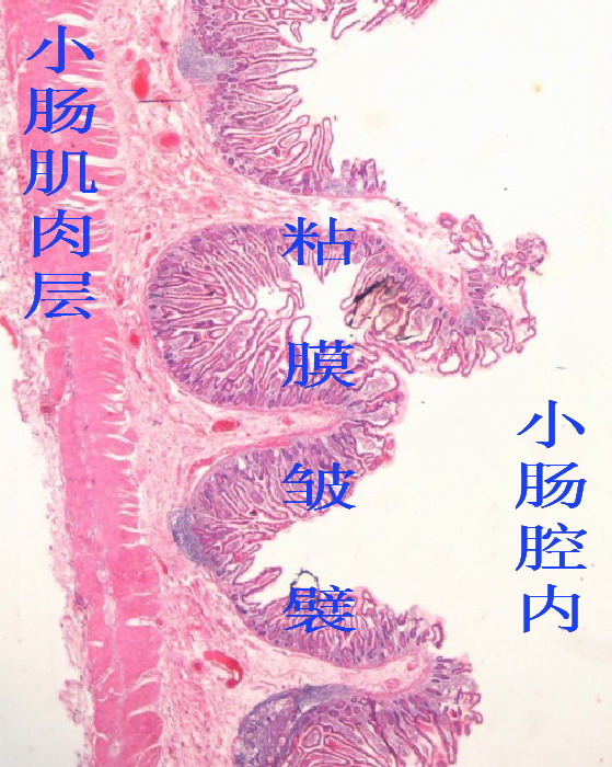图6 小肠壁结构从上往下分别为粘膜、粘膜下、肌肉、浆膜层