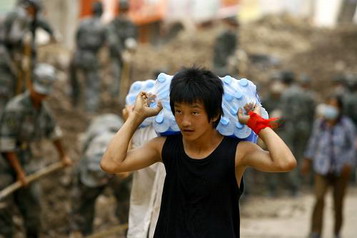 21岁的杨洋每天和同学冯瑞霞背上亲戚家里做的饼和物资发放点的水、方便面,从县城外三公里赶来。两个还不足1.6米的小姑娘被筐篓压得直不起腰。晒黑的脸庞上挂满汗滴。“走一趟大概需要近1个小时,一天最少要走5趟。”