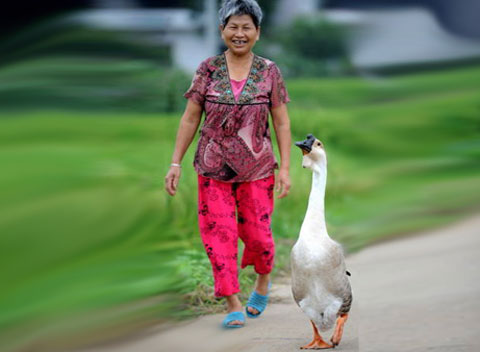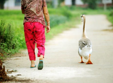 8月26日,胡美英和这只鹅走在回家的小路上。