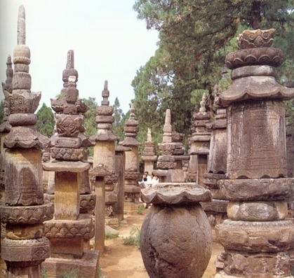 少林寺塔林,在河南登封嵩山西麓五乳峰下。塔林共有唐、宋、元、明、清各朝代的砖石塔2209座,为我国现存最大的塔林,塔高度均在15米左右,绝大多数有雕刻和题记,其造型有四角、六角、锥体、瓶体、抛物线形等,风格各异。