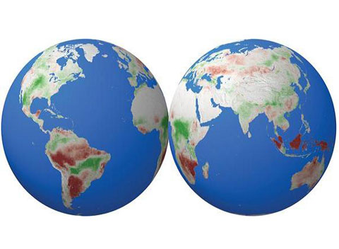 此图显示2000年至2009年之间植物增长的区域(绿色),和减少的区域(红色),颜色的深度反映趋势的程度。