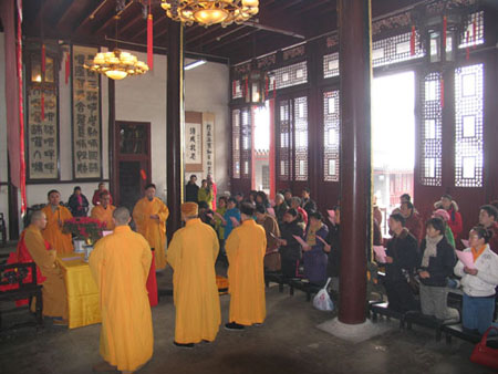 皈依仪式是最基本、最基础、最根本的仪式。因此,就象我昨天跟你们说的,你们不是皈依我。别说是我,我们今天的仪式甚至不能把文殊菩萨作为皈依对象。必须是释迦牟尼佛,因为他是教主。想象这尊释迦牟尼佛像就是释迦牟尼佛本身,而不只是尊佛像。你必须有强烈的信心,相信你就站在释迦牟尼佛前。然后,请顶礼三次。