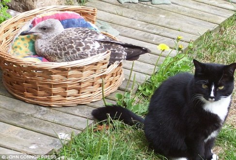 据称,这只海鸥还与其他猫一样睡在宠物的小窝里。格里姆伍德笑称,“我想,它已经认为自己是一只猫了”。