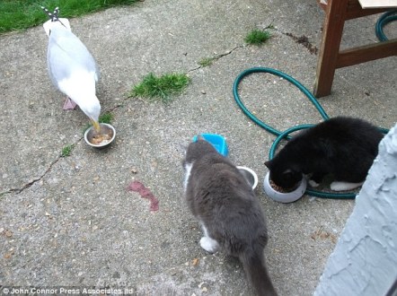 52岁的格里姆伍德说:“它的父母可能已经飞得很远,所以我们决定先照顾这只受伤海鸥一阵子”。他说,我们养的3只猫起初对它很好奇,但仅仅一周之后,这只可怜的海鸥就加入了猫的群体,并与他们分享食物。