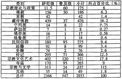 在总数为2366种研究级的论著中,藏传佛教的研究占18.6%,宗教文化艺术占17%,宗教与文学占13.2%,远远领先于其它类别。可见对藏传佛教、宗教文化艺术以及宗教与文学的研究基础扎实,研究力量雄厚。其次,关于藏传佛教的各教派,如萨加派、宁玛派等教派的研究著作、论文较少,基础薄弱,这可以指导我们在今后的研究中注意到这一现象。同时,也暗示我们今后应加强对藏传佛教各教派理论的深入研究。