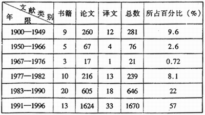 1900-1949年,49年间统计的论文为260篇,书籍9种,译文12篇。从反映的内容看以实地调查为主,介绍藏传佛教的文章居多,其中有些文章是记载外国传教士进入藏区的情况。1950年-1966年16年间,党和政府对藏区的建设和发展非常重视,这期间派出各种科学考查团对藏区的政治、经济、文化、信仰、艺术等方面进行了全面的考查和研究。在此基础上,大量的调查报告和有独立见解的专著涌现,从统计的结果也反映出来,研究级文章较多。这一时期,藏传佛教的研究有较大的进展。1967年-1976年,是“文化大革命”的十年,这期间,很多学术机构基本停止了研究工作,成果较少,从搜集的条目上可以反映出来。1977年-1982年,这5年间,我国的形势发生了很大的变化,党中央拨乱反正,学术界面貌一新,藏学研究进入正常化。这期间,发表论文数量增大,质量提高,特别是翻译文章的增多和书籍出版量的增大。1983年开始,藏传佛教著作、论文不断问世,尤以1986年以后,变化更为显著,呈直线上升趋势。如1991年至1996年5年间的时间,发表论文1624篇,出版发行书籍13种,翻译藏传佛教的文章达33篇。5年间发表文章的总数占96年间所搜集文章总数的57%。分析原因,首先是党和政府对民族工作的重视;其次是大量藏文版的藏传佛教著作翻译成汉文,在此基础上研究文章增多;再有,“宗教热”的回升,更多的人迫切希望能对藏密有一个基本了解。这些都在一定程度上促进了藏传佛教的研究工作和藏传佛教经、律、论著作的出版。
