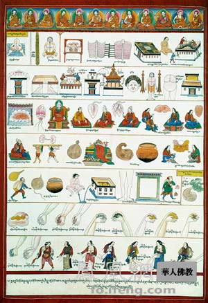 一种是用颜料绘或印刷的叫做“智唐”(“智”藏语音译,意为绘制。智唐藏语意为绘画唐卡)的唐卡。绘制唐卡所用的颜料都是不透明的矿物及植物颜料,再按一定的比例加上一些动物胶和牛胆汁。这种配方使绘就的唐卡即使过了数百年也鲜艳依旧。据敦煌研究院的同志介绍,敦煌壁画至今色泽鲜艳,除了洞口长年封闭外,与所用颜色均来自青藏高原有关。依据画背景时所用颜料色彩的不同,智唐可分为以下几种:用多种颜料画背景的彩唐;用金色颜料画成背景的金唐;用朱红色颜料画成背景的朱红唐卡;只用黑色画成背景的黑唐;还有一种叫版印智唐,它的制作方法与果唐中的版印果唐相同,唯一的区别在于果唐印在丝绢做的画布上,智唐则印在用棉布做的画布上。智唐有大有小,最小的有0.10×0.05m,甚至更小,大的不限,如有一种按寺院墙壁大小绘制的名为“坚唐”的唐卡,可大可小,是随墙壁的大小而定。据青海卫视介绍,在高级工艺美术师宗哲拉杰等的策划指导下,大型唐卡《中国藏族文化艺术彩绘大观》由青海、甘肃、西藏、四川、云南等五省区300多藏、土、汉、蒙古族艺术家集体创作,目前已进入尾声。这幅画宽2.30米,长600多米。颜料用传统配方,由金、银、珊瑚、珍珠、玛瑙、宝石等多种矿物材料和藏红花、茜草、大黄等植物材料加工配制而成。这幅画以藏族历史和藏传佛教各教派源流为主线,表现了藏族人民对宇宙和地球的形成,对人类的产生和变化,以及对未来的认识。从中可以了解到藏族历史、宗教、文化、民俗等百科知识的风貌。据有关人士推算,这幅长卷若由一个人绘制,至少需要500多年的时间。迄今为止,这幅唐卡恐怕是最大的唐卡了。