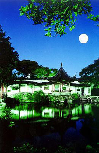 江苏苏州市网师园的“月到风来亭”地势较高,三面环水,亭内正中悬一大镜,每到明月初上,可以看见水中、镜中、空中三轮明亮的圆月,独成奇景。