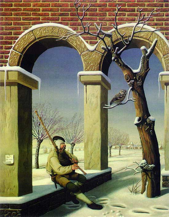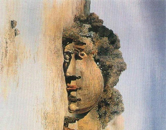 画面中,一个男人骑着马,回头看小河边的一个女人。但是,你如果从画面的上部分小河的上流来看,你就会发现一个老人隐约可见,小河成了他的白色长发,田野成了他额头的皱纹,男人的帽子成了他的眉毛,头部成了眼睛,白马马鬃成了他的胡须。