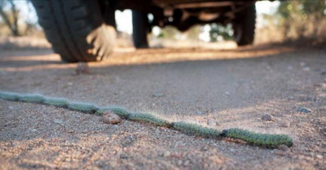 北京时间9月6日消息,据国外媒体报道,英国游客杰米-鲁尼(Jamie Rooney)在南非克鲁格国家公园游玩时,捕捉到一个令人难以置信的瞬间:136只毛毛虫排成17英尺(约合5.18米)长的整齐队列横过一条公路。
