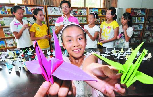 昨天,在义乌廿三里第二小学阅览室里,五年级黄婷婷同学向记者展示了她亲手做的千纸鹤。学校为庆祝第26个教师节的到来,开展了一次别开生面的“低碳生活与我同行、千只千纸鹤送祝福”活动,1700多名学生利用休息时间用废纸等折叠制作了1700多只千纸鹤,写上祝福送给老师,表达了浓浓的师生之情。