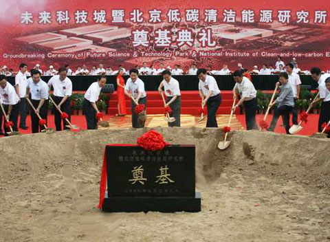 7月28日,未来科技城暨北京低碳清洁能源研究所奠基典礼在北京隆重举行。奠基典礼由中央组织部副部长李智勇主持,神华集团公司董事长张喜武、北京市副市长陈刚、国务院国资委副主任金阳先后致辞。国务院国资委主任李荣融、北京市市长郭金龙等领导同志为未来科技城暨北京低碳清洁能源研究所奠基。