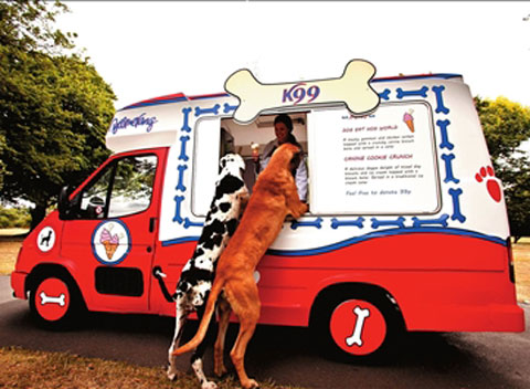 英国《每日邮报》19日报道,为了在炎炎夏日为宠物狗解暑,世界首辆狗狗冰激凌车“K99”将于24日在伦敦布姆兰宠物派对上正式营业。目前有两种冰激凌可提供:火腿加鸡肉的“狗吃猪的世界”和混合了各种口味狗饼干的“狗狗脆脆饼”。按计划,“K99”将在整个夏天“巡游”各大公园。每售出一个冰激凌,将有99便士(约合1.5美元)捐给两个宠物保护救助组织。