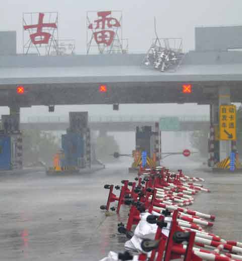 10月23日,“鲇鱼”登陆时,大风将福建高速漳浦古雷出口的牌子和栏杆吹倒,沈海高速漳州段目前已经封闭。新华社记者魏培全 摄