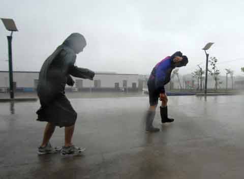 10月23日,福建漳浦古雷镇两位市民在顶风行走。新华社记者魏培全 摄