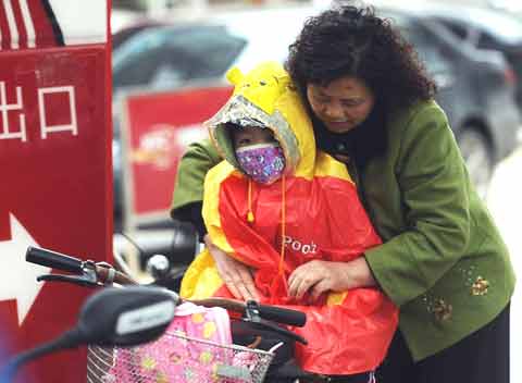 10月25日,2010年下半年首次寒潮影响我国大部地区,强冷空气自西北向东南影响中国大部地区,冷空气影响范围广、大风降温剧烈、部分地区有降雪,北方多地可达寒潮标准。图为在湖北汉口前进五路一幼儿园门前,一位孩子被家长包裹得严严实实。