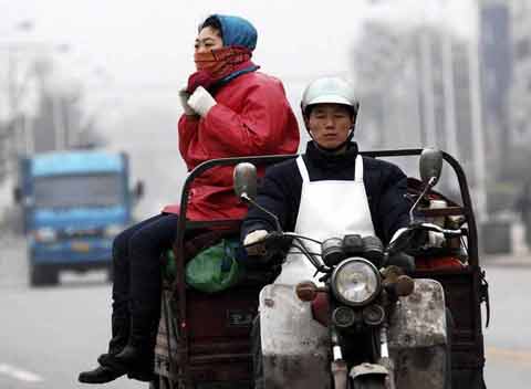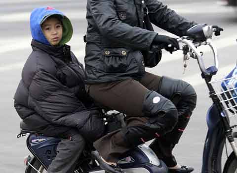 2010年10月24日,在山东威海街头,一名小孩穿着厚厚的羽绒服坐在车上和大人一起出行。(图片来自新华网)