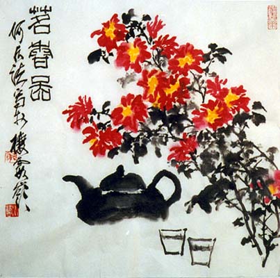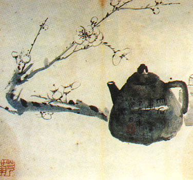 在梅兰衬托下,一壶一杯。根据自题词可知,壶中泡的是峒山秋片茶,用无锡惠泉水冲泡。