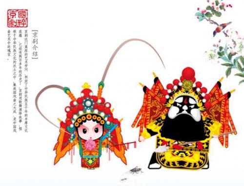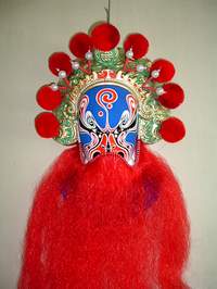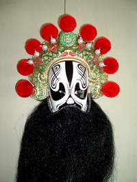 “脸谱”是指中国传统戏剧里男演员脸部的彩色化妆。这种脸部化妆主要用于净(花脸)和丑(小丑)。它在形式、色彩和类型上有一定的格式。内行的观众从脸谱上就可以分辨出这个角色是英雄还是坏人,聪明还是愚蠢,受人爱戴还是使人厌恶。 京剧那迷人的脸谱在中国戏剧无数脸部化妆中占有特殊的地位。京剧脸谱以“象征性”和“夸张性”著称。它通过运用夸张和变形的图形来展示角色的性格特征。眼睛,额头和两颊通常被画成蝙蝠,蝴蝶或燕子的翅膀状,再加上夸张的嘴和鼻子,制造出所需的脸部效果。