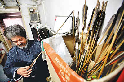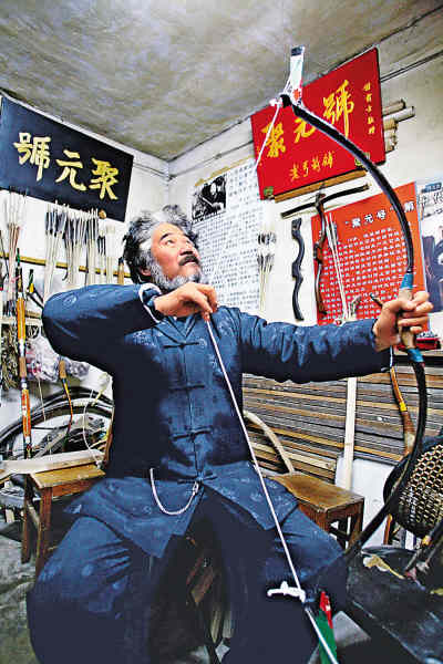 弓箭,冷兵器,中国古代战争中远距离进攻和防御的重要武器,“百步穿杨”、“万箭齐发”、“有的放矢”等成语都源于弓箭。随着时代的进步、科学技术的发展,弓箭在战争中的作用已完全丧失,弓箭艺人与制作工艺也逐渐消失。据说,全国只有北京还保留着“聚元号”一家弓箭作坊,只有“聚元号”的第十代传人杨福喜还在为传统弓箭的传承而支撑着。
