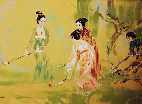 姜爱国说,看了北京故宫博物院收藏的明朝《宣宗行乐图》,任谁都不免要惊呼:“哪来的古装人物学打现代高尔夫?”明朝杜堇所画的《仕女图》中,老松树下,两位丫环权充杆弟,三位仕女优雅推杆,也算是女性打高尔夫的老祖先吧?在山西洪洞县发现的一幅壁画上,就画着元代人玩捶丸的场景。