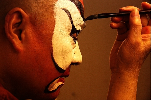 抹脸:是用毛笔蘸白粉把脸的全部或一部分涂抹成白色,表示这一类人不以真面目示人,是一种饰伪性脸谱,又称粉脸。《三国演义》的曹操在京戏中是奸雄,用大白粉脸,脸上全涂白色。