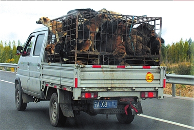 北京游客李女士介绍,她和4个朋友9月下旬驾驶两辆车前往西部几省旅行。9月30日,他们沿京藏高速公路返京,行至内蒙古磴口县路段时,发现前方有一辆宁夏银川牌照的小货车。小货车车厢里,数十只狗紧紧地挤在笼内,由于笼子并没有分层,这些狗上下踩在一起,有的狗已奄奄一息。李女士和朋友平时就关爱动物,他们猜测这些狗是被捉来的流浪狗,要被送到某地屠宰卖肉。李女士等人决定跟踪小货车,对这些狗进行保护。
