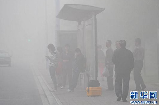 10月9日清晨,合肥街头大雾笼罩,一些乘客在大雾弥漫的公交站台候车。新华社发(杨晓原 摄)