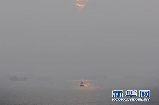 10月9日早上,辽宁省大连市甘井子区蟹子湾海域浓雾笼罩中的航标和船只若隐若现。新华社发(刘德斌 摄)