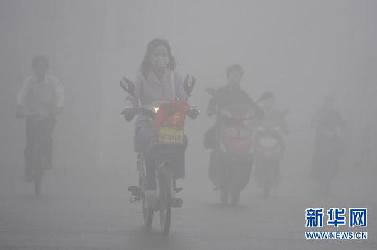 10月9日早晨,市民在大雾笼罩下的合肥街头骑车行进新华社发