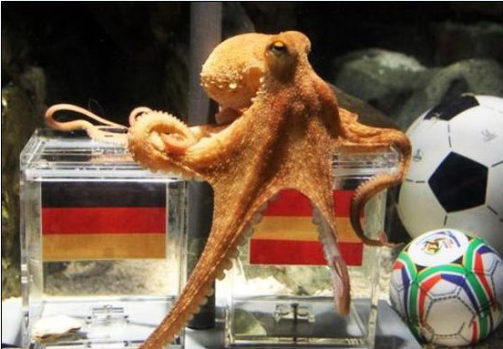 在南非世界杯上,来自德国奥博豪森水族馆的章鱼保罗因准确预测八场比赛结果一夜成名,其中更是包括西班牙战胜荷兰的决赛,以及西班牙战胜德国的半决赛。章鱼保罗职业生涯共计做了14次预测,成功猜对13场,正确率奇高。