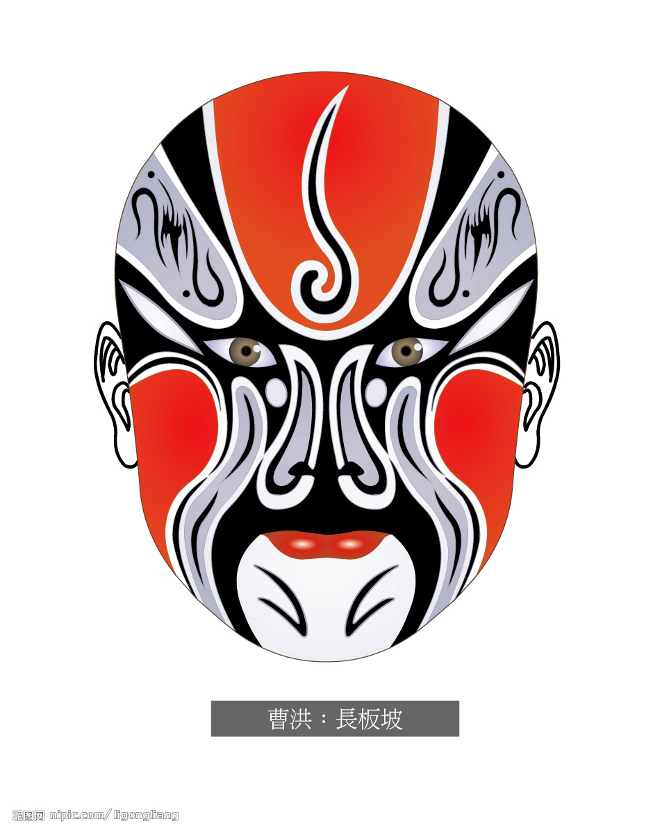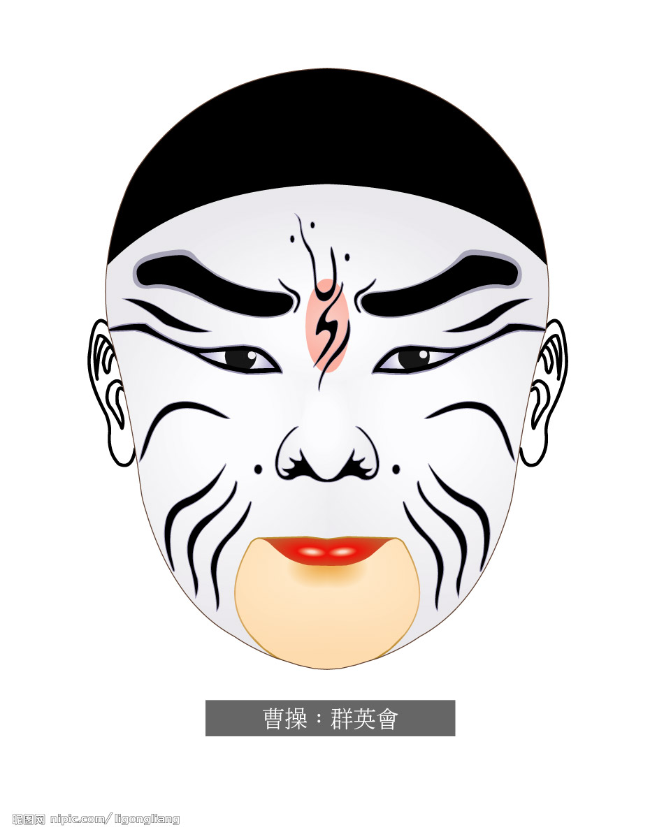 脸谱根据某种性格、性情或某种特殊类型的人物为采用某些色彩的。红色有脸谱表示忠勇士义烈,如关羽、妾维、常遇春;黑色的脸谱表示刚烈、正直、勇猛甚至鲁莽,如包拯、张飞、李逵等;黄色的脸谱表示凶狠残暴,如宇文成都、典韦。蓝色或绿色的脸谱表示一些粗豪暴躁的人物,如窦尔敦、马武等;白色的脸谱一般表示奸臣、坏人,如曹操、赵高等。