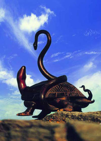 它和其他三灵一样,玄武也由天下二十八星宿变成的:斗、牛、女、虚、危、室、壁。而古时后的人对玄武它的解释有以下的数种,‘玄武’即龟。《礼记.曲礼上》云:‘行,前朱鸟而后玄武...’‘玄武’乃龟蛇。《楚辞.远游》洪兴祖补注:‘玄武,谓龟蛇。位在北方,故曰玄。身有鳞甲,故曰武。‘玄武’为蛇合体、龟与蛇交。