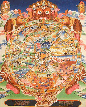 整个生死轮被死主阎罗王控制,他用双手抓住、用口咬住,表示一切六道众生上至有顶下到地狱,都逃不出死主的掌握,即:只要不能断除贪嗔痴,就无法脱离生死之轮,必定会相续不断地结生。