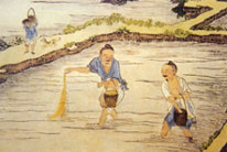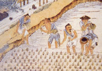 春耕期間,待到氣溫比較適合的時候,農民伯伯便將從去年秋收後,就精心挑選出的穀種拿出來發芽。猶如照顧嬰兒似的細心保溫、灑水、換水……關懷備至地呵護了一段時間,稻穀發芽發的很好,農民伯伯就將稻芽撒到一塊塊營養特別豐富的水田里長成秧苗。我們的童年就開始了。 |