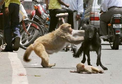 据英国媒体8月21日报道,日前猴子妈妈在印度首都新德里繁忙拥挤的街头勇救亲子的一组图片感动了无数网友——照片中的小猴先是在过马路时被一辆电动车碾过,躺在街头哀鸣时又遭到一只恶犬的攻击,就在猴宝宝即将葬身犬口时,猴妈妈冲上来疯狂撕咬恶狗,最终将其赶跑,成功救出了宝宝。