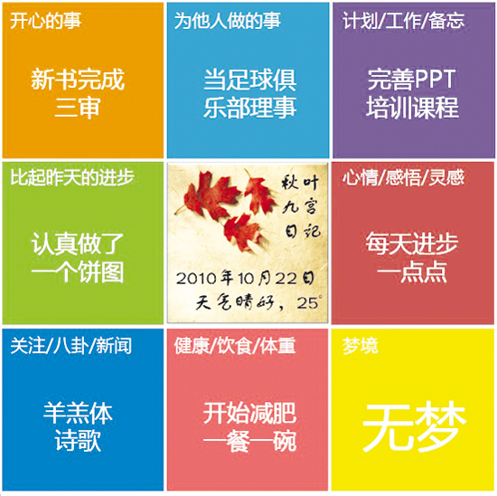 记者登录一个九宫格日记网站一探究竟。只见电脑画面上出现一个大大的“九宫格”,分别由9个大小一致的方块组成,与图表非常接近。最中间的一个格子记录日期和天气,其余八格的内容则由记录者按照喜好设计。